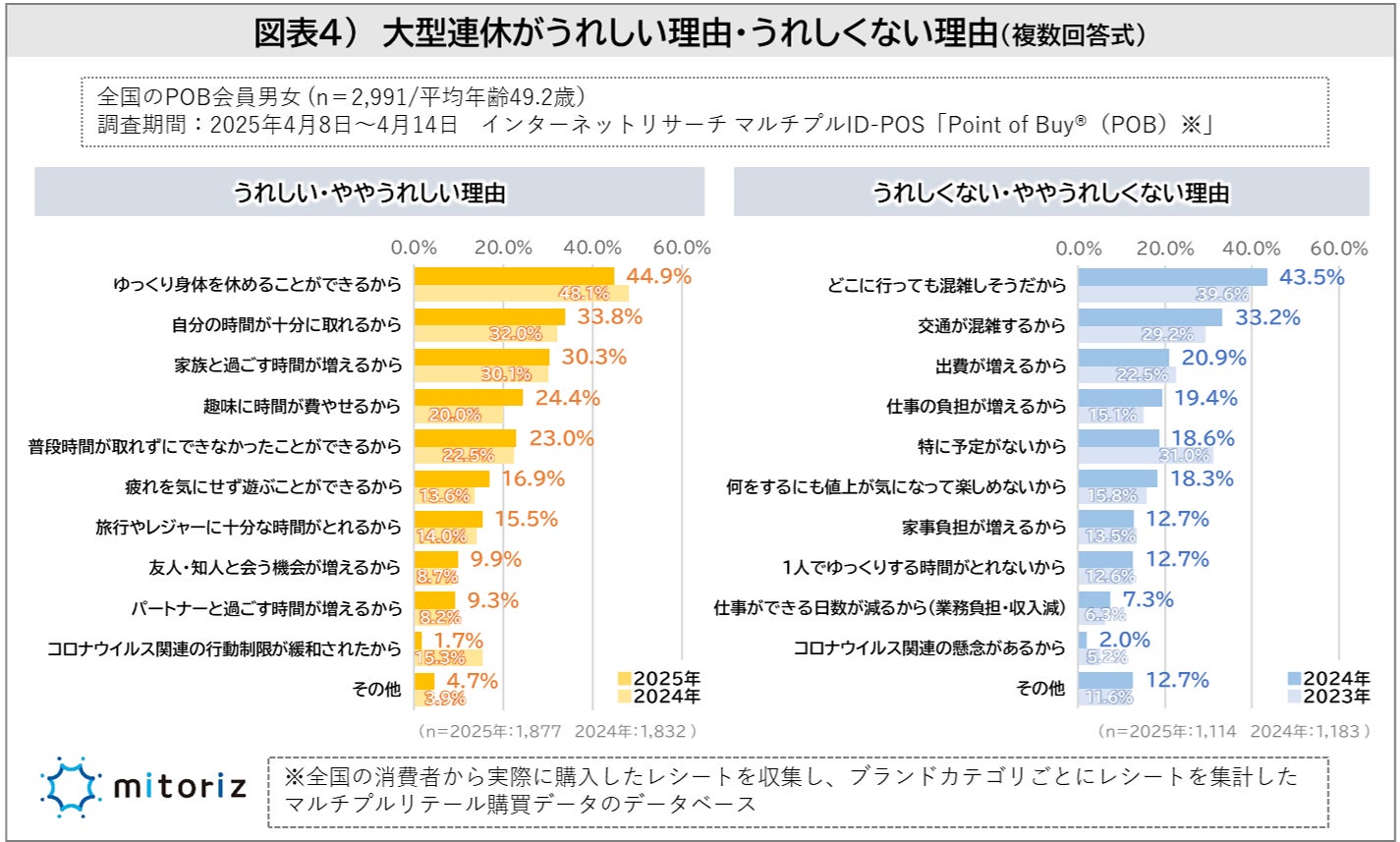 大型連休について「うれしい・ややうれしい」と回答した1,877人を対象に、その理由が調査されました。最も多かった理由は2024年に引き続き「ゆっくり身体を休めることができるから(44.9%)」でした。