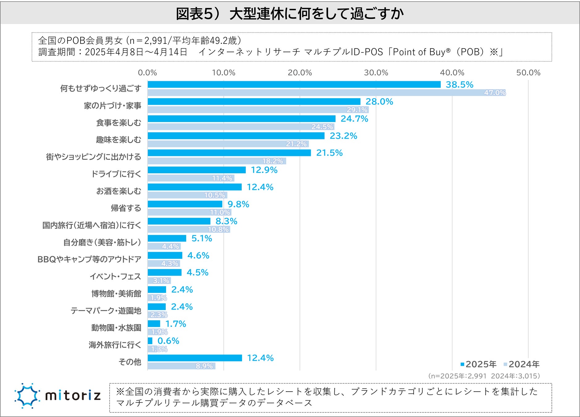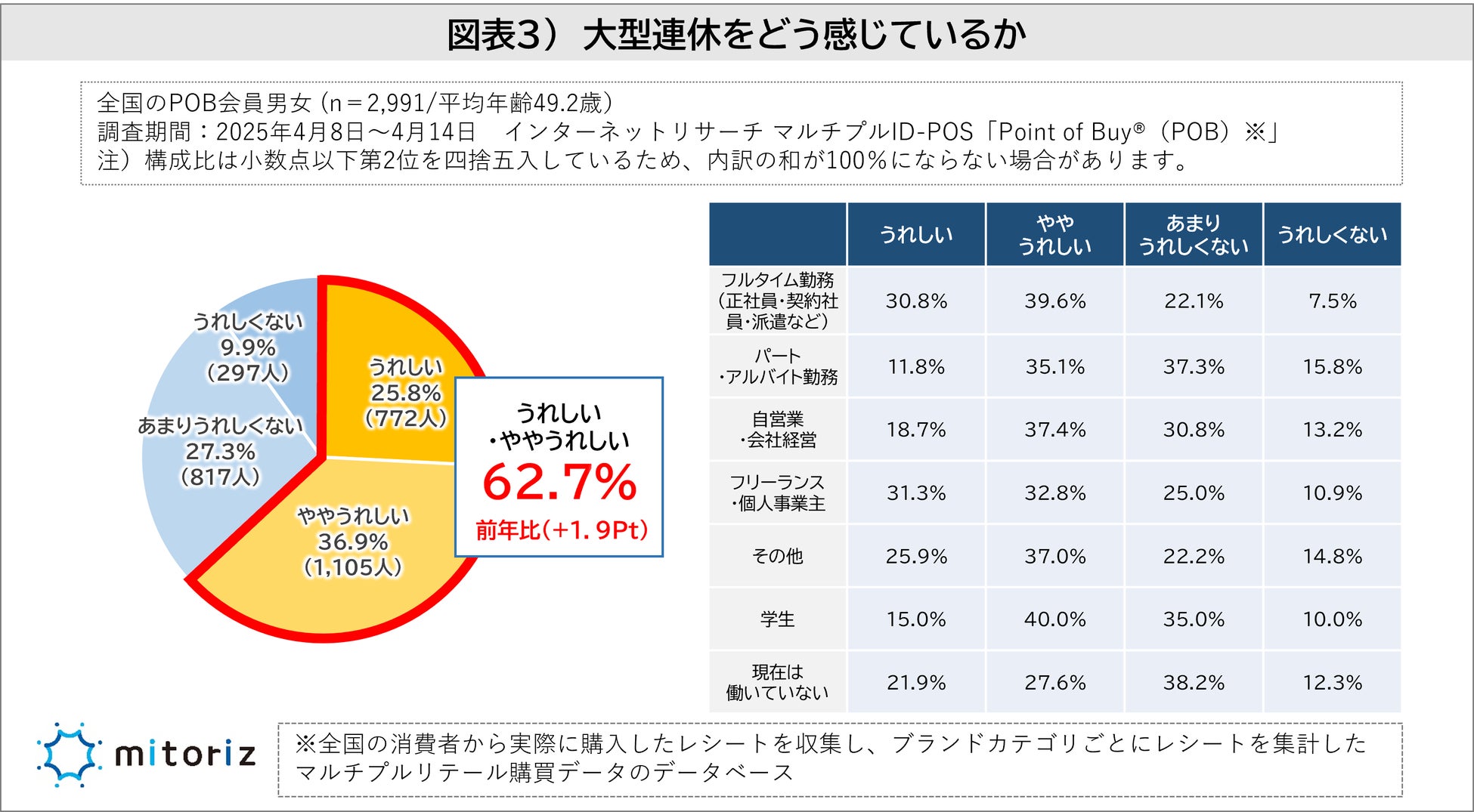 株式会社mitoriz(本社:東京都港区、代表取締役社長:木名瀬博)は、同社が運営する消費者購買行動データサービス「Point of Buy®(POB)」の会員2,991人を対象に「大型連休に関する調査」を実施しました。この調査では、物価上昇による生活コスト増加が続く中での大型連休(最大11連休)に対する意識、休暇の日数、過ごし方、予算などについて分析されています。
