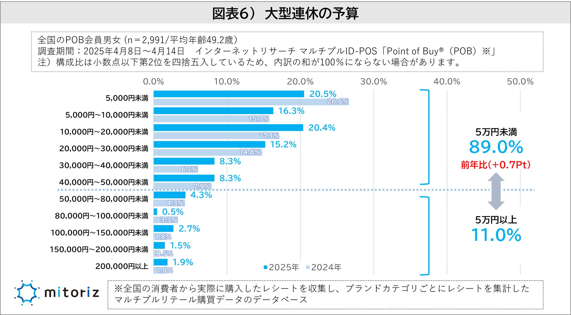 ・連休の予算は「5万円未満」が89.0%で引き続き節約傾向も、5,000円未満は前年比6.1Pt減となっています