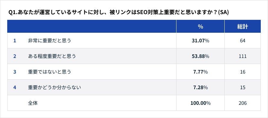 - 2.1 Q1. あなたが運営しているサイトに対し、被リンクはSEO対策上重要だと思いますか?