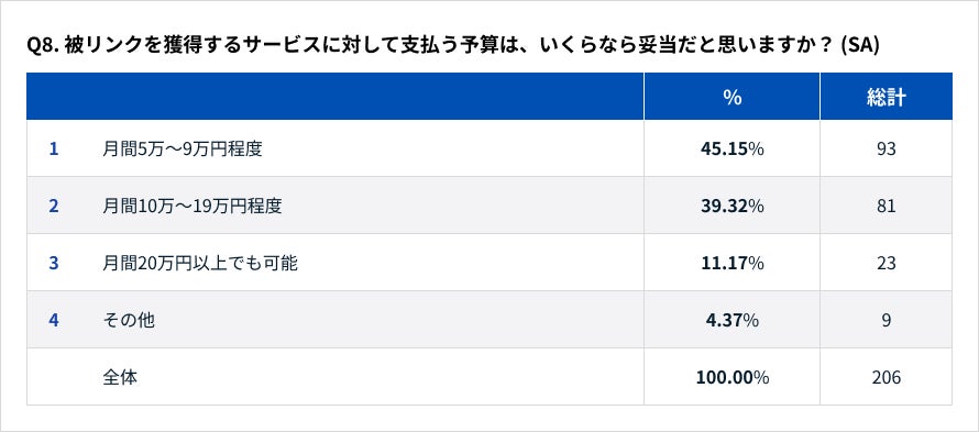 - 2.8 Q8. 被リンクを獲得するサービスに対して支払う予算は、いくらなら妥当だと思いますか?