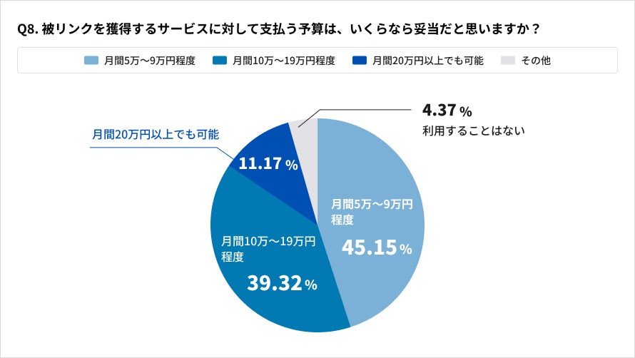 被リンク獲得支援サービスについては7割以上が利用に前向きであり、特に「月間5万~19万円程度」の予算感を持つ運営者が多いことから、適切な価格帯でのサービス提供が求められていると考えられます。