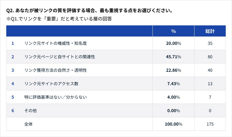 - 2.2 Q2. あなたが被リンクの質を評価する場合、最も重視する点をお選びください。