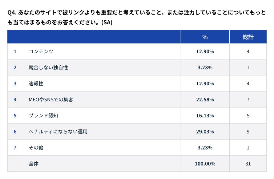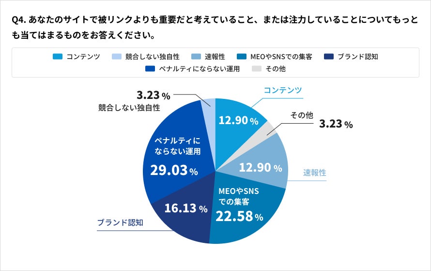 Q4. あなたのサイトで被リンクよりも重要だと考えていること、または注力していることについて最も当てはまるものをお答えください。