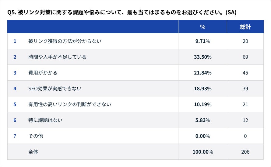Q5. 被リンク対策に関する課題や悩みについて、最も当てはまるものをお選びください。