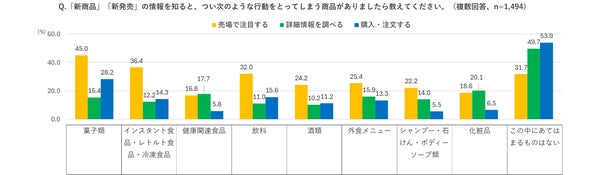 調査ではまず、8つの商品ジャンルについて、「新商品」「新発売」の情報を知った際に思わず取ってしまう行動について質問されています。