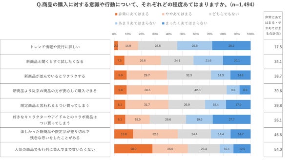 「トレンド情報や流行に詳しい」と自認する人は「非常にあてはまる・ややあてはまる」の合計で17.5%でした。同様の合計値で見ると「新商品が並んでいるとワクワクする」は38.7%、「新商品と聞くとすぐ試したくなる」は34.1%となっており、トレンドに詳しいという自己認識がなくても、「新商品」に心を動かされる消費者は多いことがわかります。
