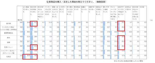 また、新商品を購入・注文した理由を尋ねたところ、どの商品ジャンルにおいても「自分の好みの商品だと思った」が最も多い理由として挙げられ、特に「菓子類」と「外食メニュー」においては40%を超える回答率でした。