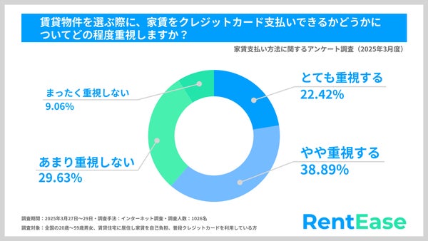 賃貸物件選択の際に家賃をクレジットカードで支払えるかどうかをどの程度重視するかという質問では、「とても重視する」(22.4%)、「やや重視する」(38.9%)を合わせると、全体の61.3%の人が重視していると回答しています。