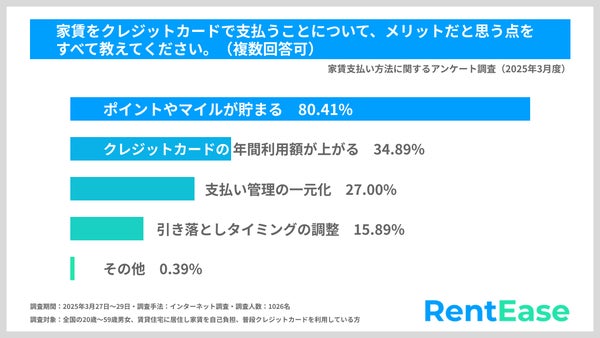 家賃をクレジットカードで支払うことのメリットだと思う点(複数回答可)を尋ねたところ、「ポイントやマイルが貯まる」が80.4%と圧倒的な支持を獲得し、他の選択肢を大きく引き離す結果となりました。
