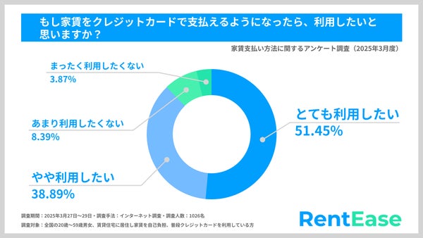 現在、家賃をクレジットカードで支払っていない、または支払い可能か不明な人(n=620)に対し、もし家賃をクレジットカードで支払えるようになったら利用したいと思うか尋ねたところ、「とても利用したい」が51.5%、「やや利用したい」が36.3%となり、合計で87.7%もの人が強い利用意向を示していることが判明しました。