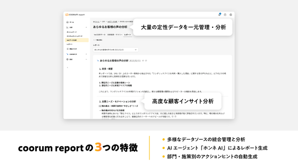 株式会社Asobica(本社:東京都品川区、代表取締役CEO:今田 孝哉)は、ゼロパーティーデータを基盤としたホンネデータプラットフォーム「coorum(コーラム)」の新サービスとして、AIを活用して顧客の声を一括管理・分析し、改善提案書の作成まで自動化する「coorum report(コーラムレポート)」をローンチしたことを発表しました。