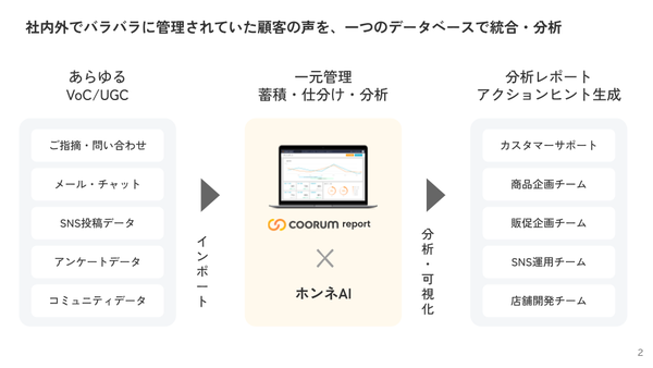 このサービスにより、SNSやお問い合わせ、アンケート、商品レビューなど多様なデータソースから得られる顧客の声を統合・分析し、商品開発やマーケティング改善に活用できるようになります。