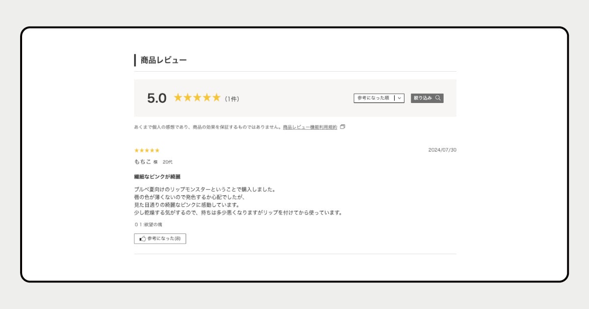 商品詳細ページには、実際に商品を購入したユーザーの情報(年代、レビュー内容、5つ星評価など)が一覧表示されるようになりました。これにより、ユーザーは客観的な評価を参考にしながら購買判断を行うことができるようになり、顧客体験(CX)の向上に寄与しているとのことです。