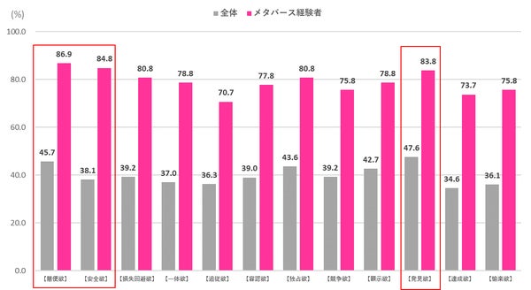 メタバース経験者では8割が、調査対象者全体でも4割が「現実よりメタバースの方が12欲求を達成できると思う」と回答しました。なおメタバース経験者・全体いずれも「発見欲」「簡便欲」がTOP2と、セレンディピティや生活の様々なことを簡便にできる価値を感じる人の割合が多い点は共通していますが、全体では高くない「安全欲」がメタバース経験者では3位となっています。利用経験を通じて、メタバースは不安よりもむしろ様々な領域の安心・安全を高めてくれるものという信頼感が生まれていると推察されています。