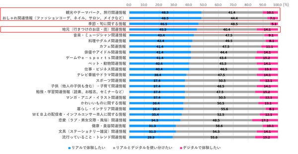 メタバース経験者は、すべてデジタル上で完結させたいわけではなく、ジャンルや場面によって「リアルとデジタルを使い分けたい」と考えていることが分かりました。なお「観光やテーマパーク、旅行関連情報」「おしゃれ関連情報」「地元(行きつけのお店・街)関連情報」の3項目においては「リアルとデジタルを使い分けたい」よりも「リアルで体験したい」が高くなっており、体験・ファッションなどの没入感・臨場感に関わる領域では「リアルのほうが良い」という感覚がある人が多いことがうかがえます。
