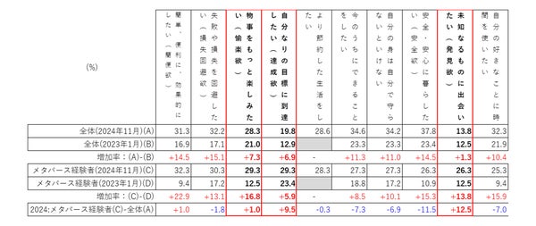 - メタバース経験者は、同研究所が情報を引き寄せ貯めこむ行動(情報プール)の元となる欲求として定義した12欲求のいずれも調査対象者全体より高く(全体+32.9%)、意欲的な人々であることが明らかになっています