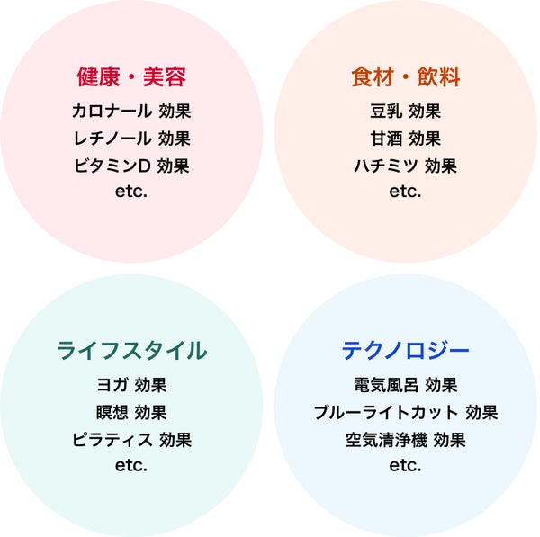 「健康・美容」カテゴリには、カロナールなどの医薬品のほか、レチノールやビタミンDといった美容目的で広く活用されている成分が含まれています。「食材・飲料」カテゴリでは、豆乳や甘酒、ハチミツなどの食品が「効果」とともに検索されていました。また、「ライフスタイル」カテゴリではヨガや瞑想といった活動が、「テクノロジー」カテゴリではブルーライトカットや空気清浄機などの製品が「効果」という言葉と一緒に検索されていることがわかりました。