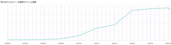 「耳つぼジュエリー」とは、チタン製のボールが付いたシールを耳に貼ることで、耳つぼを刺激しながらおしゃれも楽しめる施術のことです。このキーワードの検索数は2024年10月と2025年3月を比較すると約6.8倍に増加しており、わずか半年間で急激な伸びを示しています。特に昨年末から検索数が増加していることがデータから読み取れます。