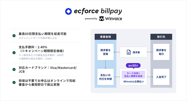 こうした背景から、コマース事業者のキャッシュフロー改善における課題を解消するため、中小企業向けファイナンスサービス「BizGrowth」を提供するスマートプラスクレジットと請求書支払いプラットフォーム「Winvoice」を提供するインフキュリオンの2社とそれぞれ提携し、請求書支払いをより柔軟に可能にする新サービス「ecforce billpay」の提供を開始することになったとのことです。