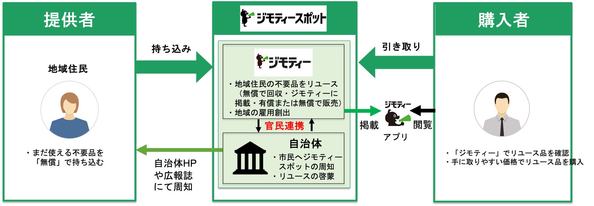 ジモティースポットは、「不要になったけれどもまだ使えるモノ」を地域のコミュニティ内で譲り合うことができるサービスです。持ち込み希望の方は、ジモティースポットに持ち込むだけで、手軽に必要とする方へ譲渡することが可能です。譲り受け希望の方は、持ち込まれたモノの情報を地域の情報サイト「ジモティー」で検索し、ジモティースポットで引き取ることでマッチングが成立する仕組みとなっています。