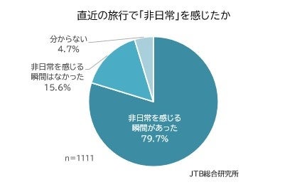 旅に求めることとして「リフレッシュ」や「癒し」といった気分に関わる要素以外に、上位に挙がったのが「非日常」です。そこでJTB総合研究所は直近の旅行で「非日常」を感じたかどうかを調査したところ、約8割の方が「非日常を感じる瞬間があった」と回答したそうです。