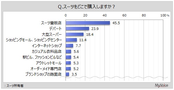 スーツ所有者がスーツを購入する場所(複数回答)としては、「スーツ量販店」が45.5%で最も多く、次いで「デパート」が23.9%、「大型スーパー」が18.4%となっています。