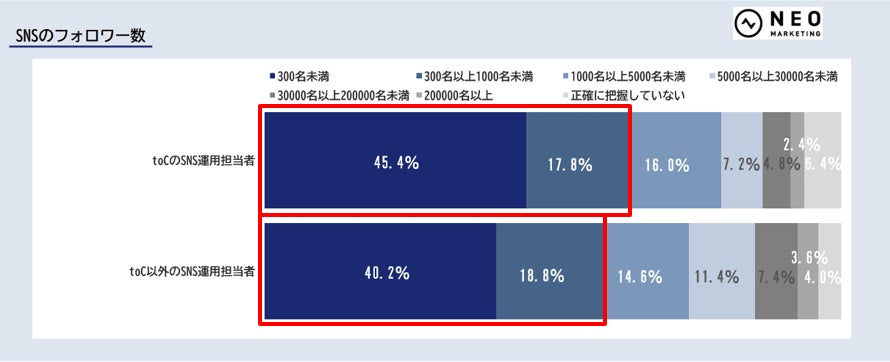 2021年の調査と比較して、全体的に企業アカウントのフォロワー規模が拡大していることが判明したとネオマーケティング社は報告しています。2021年調査では「toC」のSNSにおけるフォロワー1000名未満の割合は63.2%、「toC以外」では59.0%でしたが、今回の調査ではそれぞれ57.6%・55.8%にまで減少しているとのことです。