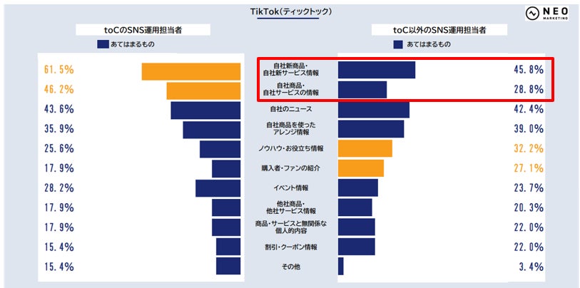 「TikTok」の場合、投稿内容に明確な違いが見られたと報告されています。「toC」では「自社新商品・自社新サービス情報」「自社商品・自社サービスの情報」といった売上に直結する宣伝色の強い投稿や「ノウハウ・お役立ち情報」の比率が高い一方、「toC以外」では「自社のニュース」「購入者・ファンの紹介」「他社商品・他社サービス情報」など、売上には直結しないが認知や比較・検討材料となる投稿が多い傾向にあるようです。