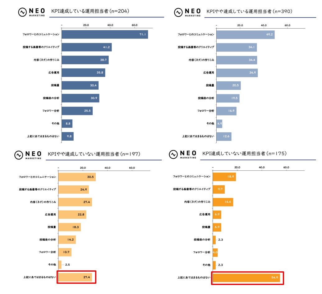 一方、KPI未達成層は「いいね」すら得られにくく、「きちんと把握していない」という回答も30%を超えており、フォロワーの反応を分析する余裕がない、あるいは運用に自信が持てない状況がうかがえると分析されています。