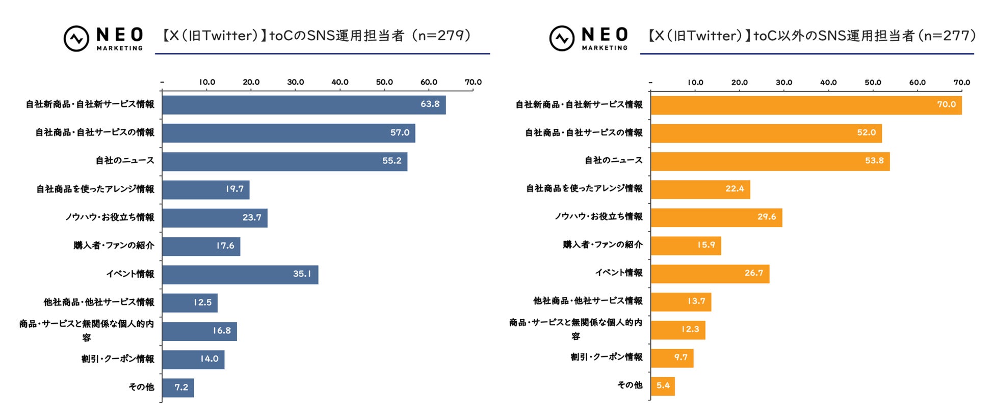 「X(旧Twitter)」の場合、「toC」と「toC以外」のどちらもトップが「自社新商品・自社新サービス情報」となっており、次いで「自社商品・自社サービスの情報」または「自社のニュース」、さらに「ノウハウ・お役立ち情報」「イベント情報」が続いていることが明らかになりました。全体的に両者の投稿内容の傾向は近似していることがわかったとのことです。