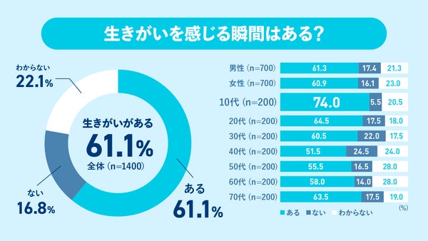 調査ではまず、生きがいを感じる瞬間は人生において大切かと質問したところ、「そう思う」が59.9%、「ややそう思う」が33.4%と、合計で全体の93.3%が生きがいは大切だと回答しています。しかし一方で、生きがいを感じる瞬間があるかという質問に対しては、61.1%が「ある」と答えたものの、16.8%は「ない」、22.1%は「わからない」と回答しました。