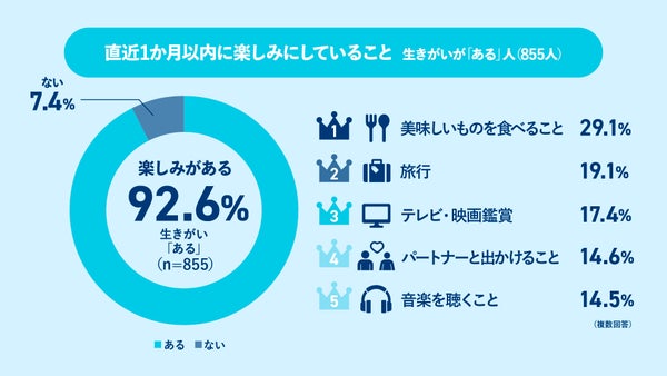 身近な小さな幸せとして、直近1カ月以内に楽しみにしていることを聞いたところ、生きがいが「ある」人は92.6%、生きがいがない・わからないと答えた人でも82.9%が身近な楽しみを持っていることが明らかになりました。