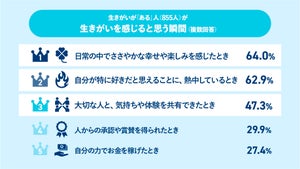 生きがいが「ある」と答えた人に、どんな瞬間に生きがいを感じるかを質問したところ、「日常の中でささやかな幸せや楽しみを感じたとき」(64.0%)や「自分が特に好きだと思えることに、熱中しているとき」(62.9%)が高い結果となりました。具体的に聞くと、「娘の成長を感じたとき」、「ペットの犬猫が、すやすや寝ているのをホッとしながら見ているとき」といった家族やペットとの他愛ない日常や、推し活、趣味など、様々な「生きがいを感じる瞬間」が挙げられています。