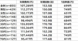 金銭的に無理をしないことが生きがいを継続するコツとなっていますが、実際に生きがいのためにかけている費用を聞いたところ、年間で平均107,289円、生きがい活動を行う回数は年間で平均153.5回となりました。1年間で平均すると1週間に3回程度活動し、1回の費用は699円という結果になっています。