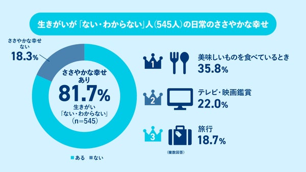 生きがいがある人は日常の中でささやかな幸せや楽しみを感じたときに生きがいを感じていますが、生きがいが「ない・わからない」と答えた人に日常の中でささやかな幸せを感じるときを質問したところ、「美味しいものを食べているとき」(35.8%)、「テレビ・映画鑑賞」(22.0%)、「旅行」(18.7%)などが挙げられ、生きがいが「ない・わからない」人の81.7%が、ささやかな幸せを感じていることが明らかになりました。