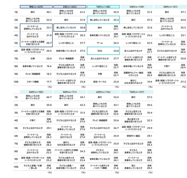 また、年代別に見ると、10代は「美味しいものを食べているとき」(45.9%)に次いで「推し活をしているとき」(45.3%)が高く、「SNS」(33.8%)と答えた人も3人に1人と多くなっています。一方、他の世代では「美味しいものを食べているとき」と「旅行」が1位と2位を独占し、生きがいを感じる瞬間のツートップとなっています。
