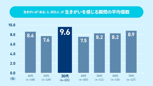 また、複数選択式で回答する、生きがいを感じる瞬間の回答個数を集計したところ、その平均個数は8.4個となり、生きがいが「ある」人は生きがいを複数持っていることがわかりました。年代別に見ると、最も多かったのは30代で平均9.6個となり、生きがいのバリエーションが豊かな世代と言えそうです。