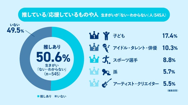 自分が好きな人や物事のことを"推し"と呼び、それらを応援することが推し活です。近年その市場は急成長し、世間からも注目されています。そこで、応援しているものや人がいるかと質問したところ、生きがいが「ない・わからない」と答えた人でも50.6%と半数に"推し"がいることがわかりました。"推し"の内容を聞くと、「子ども」(17.4%)、「アイドル・タレント・俳優」(10.3%)、「スポーツ選手」(8.8%)らが上位に挙げられています。