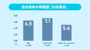 最後に、自分自身の幸福度を10点満点で自己採点してもらったところ、その結果を平均すると、全体は6.5点、生きがいが「ある」人は7.1点、生きがいが「ない・わからない」人は5.4点となりました。日常のささやかな幸せに生きがいを見いだす人は、自身の幸福度が高いと評価しているという結果になりました。身近な幸せに気付き、それを生きがいとして認識することが、自分自身の幸福度を高めることにつながると考えられます。