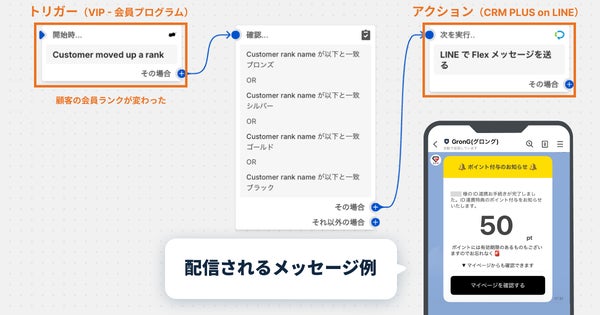 「CRM PLUS on LINEを活用すると、Shopify上にLINEのID連携者のデータを集約できるため、メッセージ配信の自由度が高いのも魅力です。例えば、Shopifyアプリ『VIP - 会員プログラム』と連携した『ポイントの付与通知・会員ランクの変動通知』などもスムーズに実現できました」と清水氏は説明しています。