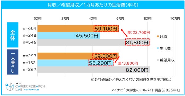 キャリアリサーチラボの調査によりますと、大学生のアルバイトによる月収は平均で59,100円である一方、希望するアルバイト月収は平均81,800円と、現実と希望の間には22,700円の大きな差があることが明らかになりました。