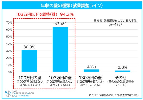 同調査によりますと、アルバイトに従事する大学生のうち、54.6%が「年収の壁」を意識して就業調整を行っていることが明らかになりました。就業調整をしている学生の中では、94.3%(「100万円を超えないようにしている」と「103万円を超えないようにしている」の合計)が「103万円以下」で収入を調整していると回答しています。