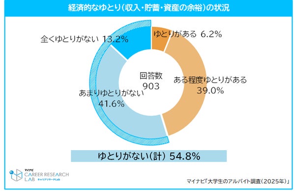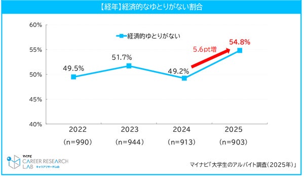 キャリアリサーチラボが実施した調査によると、アルバイトに従事している大学生の「経済的なゆとりがない」と回答した割合が54.8%(「あまりゆとりがない」と「全くゆとりがない」の合計)に達したことが明らかになりました。この数値は前年と比較して5.6ポイント増加しており、調査が開始された2022年以降で最も高い数値となっています。