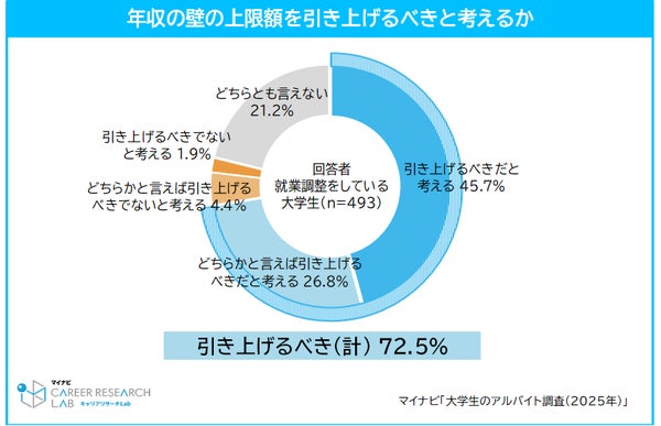 キャリアリサーチラボの調査では、就業調整を行っている大学生に対して「年収の壁の上限額を引き上げるべきだと考えるか」という質問を行ったところ、72.5%(「引き上げるべきだと考える」45.7%と「どちらかといえば引き上げるべきだと考える」26.8%の合計)が「引き上げるべき」と回答したことがわかりました。