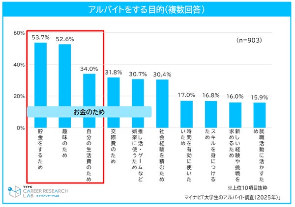 また、同調査では大学生がアルバイトをする目的について複数回答形式で質問しており、「貯金をするため(53.7%)」「趣味のため(52.6%)」「自分の生活費のため(34.0%)」など、金銭的な理由に関する項目が上位を占める結果となりました。一方で「社会経験を積むため(30.4%)」「スキルを身につけるため(16.8%)」「就職活動に活かすため(15.9%)」といった社会経験やスキル習得に関連する項目は、相対的に低いスコアとなっています。