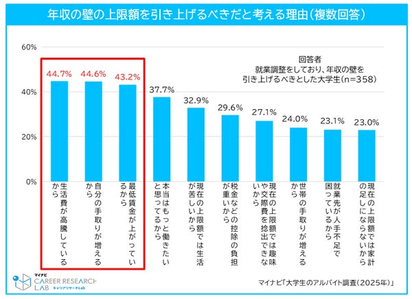 「年収の壁の上限額を引き上げるべき」と考える理由について複数回答形式で質問したところ、「生活費が高騰しているから」が44.7%で最も多く、次いで「自分の手取りが増えるから」が44.6%、「最低賃金が上がっているから」が43.2%という結果になりました。