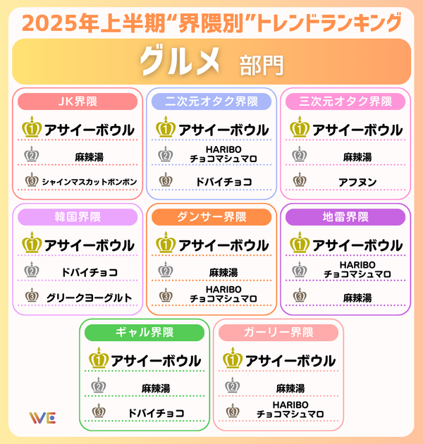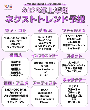 また、今回の界隈別トレンドランキングと併せて、全国約180店舗のWEGOスタッフを対象にした大規模アンケートによる「2025年下半期ネクストトレンド予想」も公開されています。グルメや漫画・アニメ、インフルエンサーなど、さまざまなジャンルから「次に流行る」と注目されているコンテンツが紹介されています。