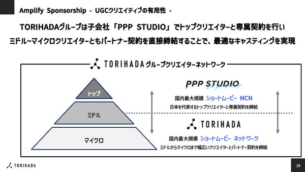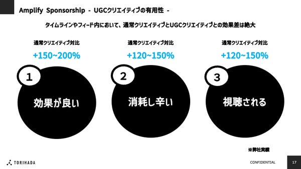 一般ユーザーのオーガニック投稿に近い「UGCクリエイティブ」は、タイムラインやフィード上でユーザーに違和感なく広告訴求できるため、高い広告パフォーマンスを発揮することが特徴だということです。「TORIHADA Amplify Sponsorship」では、TORIHADAが保有する国内最大規模のクリエイターネットワークを活用し、クライアントの商品・サービスに最適なクリエイターのキャスティングを行うことで、広告パフォーマンスの最大化を目指すとのことです。