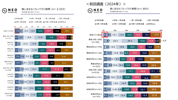今回の調査では、推し活歴「半年未満」が7.4%と2024年比で+2.2ポイント、「20年以上」が20.3%で+2.4ポイントとなり、入口と最古参の両端が着実に拡大しました。